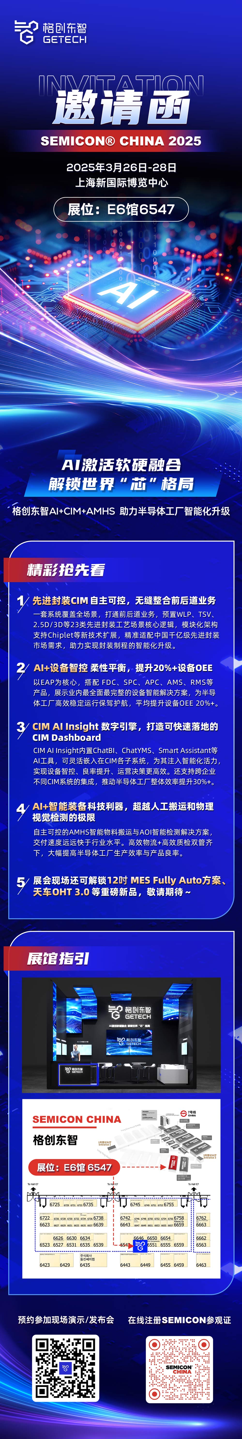 2025年3月26日-28日,一年一度的半导体产业发展风向标——SEMICON China 2025将于上海新国际博览中心揭开序幕。作为聚焦半导体领域数字化转型的AI驱动的工业智能解决方案龙头企业,恒行5将携一系列先进业务表现与落地成果精彩亮相,展示“AI+CIM+AMHS”三大引擎,如何助力半导体工厂向智能化进阶,期待您的关注与到访!多年来,恒行5持续勤恳服务于半导体产业数字化转型。公司自主可控的全栈式半导体智能工厂解决方案,涵盖晶圆制造、封装测试等全产业链环节,关键产品包括MES、EAP、SPC、FDC、RMS、QMS等核心系统,以及AMHS解决方案和智能工厂数字化升级服务。凭借全栈自主研发能力,强大的交付能力,丰富的行业经验,恒行5成为中国泛半导体市场占有率Top1企业,累计客户数近300个,服务项目数1200+,客户复购率高达70%+。 值得关注的是,随着AI与大模型技术的愈发成熟,公司近日接入DeepSeek的大模型平台,将会在AI与大模型应用落地与解决方案创新上带来全新赋能,进一步夯实半导体数字化业务服务优势,为客户在数转阶段的成功实践落地与高质量发展保驾护航。